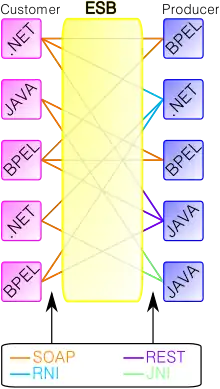 An enterprise service bus (ESB) implements a communication system between mutually interacting software applications in a service-oriented architecture (SOA). It represents a software architecture for distributed computing, and is a special variant of the more general client-server model, wherein any application may behave as server or client. ESB promotes agility and flexibility with regard to high-level protocol communication between applications. Its primary use is in enterprise application integration (EAI) of heterogeneous and complex service landscapes.