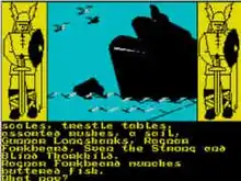 If the parser cannot recognise a command, the game will respond to the player with one of a number of phrases with which the gamer will be very familiar by the game's end. These include "Eh?", the response to a nonsense phrase; "Try again" for a command that is almost recognisable; and "Do WHAT to [an object]..." if the parser recognises the object in question but not the verb. Entering "TALK" or "SPEAK" will cause the response "Actions speak louder than words". One amusing feature of this is that the parser always uses the full name of an item, such that the command "TOUCH STEWPOT" will cause the response "Do WHAT to a large iron stewpot". There are also a number of tempting rooms or locations that look as though they can be visited at sea, but on attempting to visit them the computer responds with "The natives won't help" or "Erik finds nothing but sheep".