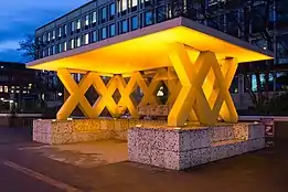 Sottsass created a vast body of work: furniture, jewelry, ceramics, glass, silver work, lighting, office machine design and buildings. He inspired generations of architects and designers. In 2006 the Los Angeles County Museum of Art held the first major museum survey exhibition of his work in the United States. A retrospective exhibition, Ettore Sottsass: Work in Progress, was held at the Design Museum in London in 2007. In 2009, the Marres Centre for Contemporary Culture in Maastricht presented a re-construction of a Sottsass' exhibition 'Miljö för en ny planet' (Landscape for a new planet), which took place in the Nationalmuseum in Stockholm in 1969.[10] In 2017, on the occasion of Sottsass' 100th birthday, the Met Breuer museum in New York City presented the retrospective Ettore Sottsass: Design Radical.[27]