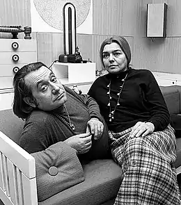 In 1949 Sottsass married Fernanda Pivano, a writer, journalist, translator and critic.[3] From 1954 to 1957 he was a member of the International Movement for an Imaginist Bauhaus, resigning due to the movement's perceived aggression and its lack of professionalism.[4] In 1956, Sottsass traveled to New York City and began working in the office of George Nelson. He and Pivano traveled widely while working for Nelson, and returned to Italy after a few months.