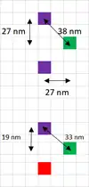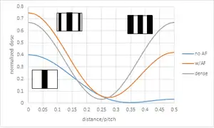 The combination of the off-axis asymmetry and the mask shadowing effect leads to a fundamental inability of two identical features even in close proximity to be in focus simultaneously.[73] One of EUVL's key issues is the asymmetry between the top and bottom line of a pair of horizontal lines (the so-called "two-bar"). Some ways to partly compensate are the use of assist features as well as asymmetric illumination.[74]