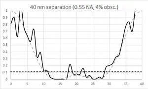 An extension of the two-bar case to a grating consisting of many horizontal lines shows similar sensitivity to defocus.[75] It is manifest in the critical dimension (CD) difference between the top and bottom edge lines of the set of 11 horizontal lines.