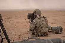 The missile is ejected from the launcher to a safe distance from the operator before the main rocket motors ignite – a "soft launch arrangement".[17] This makes it harder to identify the launcher, though backblast from the launch tube still poses a hazard to nearby personnel. The firing team may move as soon as the "fire-and-forget" missile has been launched, or immediately prepare to fire on their next target.[18] The missile system is sometimes carried by two soldiers consisting of a gunner and an ammunition bearer, although one soldier can fire it. While the gunner aims and fires the missile, the ammunition bearer scans for prospective targets, watches for threats like enemy vehicles or troops and ensures that personnel and obstacles are clear of the missile's launch backblast.