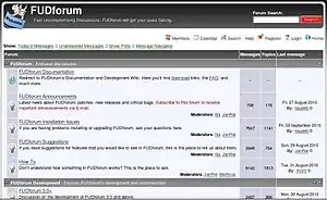 FUDforum is a free and open-source Internet forum software, originally produced by Advanced Internet Designs Inc., that is now maintained by the user community. The name "FUDforum" is an abbreviation of Fast Uncompromising Discussion forum.[2] It is comparable to other forum software. FUDforum is customizable and has a large feature set relative to other forum packages.[3]