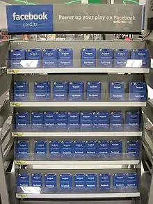 - Gift cards — In the U.S., Target, Walmart, Best Buy, Radio Shack, GameStop, and Safeway sold Facebook credit gift cards in their stores. Facebook Credits gift cards were sold in Tesco and Game shops in the U.K.[19] Facebook Credits gift cards were also sold in over 500,000 outlets in five Southeast Asian countries, India, Australia, and New Zealand.[20]
