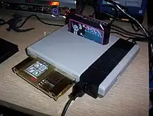 Generation NEX is a Nintendo hardware clone released in 2005.[13][14] It is compatible with Japanese Famicom and North American/European NES cartridges. A front-loading slot is used for NES games, like the original console, while a top-loading slot handles Famicom games.[15] Messiah Entertainment Inc., a company based in Los Angeles,[16] announced the Generation NEX in May 2005.[17] The console was shown at the Classic Gaming Expo that August, and was scheduled for release in September 2005.[18][19][20] The NEX is a slimmer version of the original NES, measuring an inch and a half in height.[15] The console uses a custom-designed integrated circuit based on NES-on-a-chip, which is used by most Nintendo clone consoles.[21] The NEX is compatible with approximately 95 percent of NES games,[22] excluding games such as Castlevania III: Dracula's Curse.[13][15] The console includes stereo sound capabilities for homebrew games.[13]