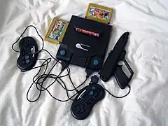 The Power Player Super Joy III consoles (also known as Power Games and XA-76-1E) are a line of unauthorized handheld Nintendo Entertainment System/Famicom clones manufactured by NRTRADE that are sold in North America, Brazil, Europe, Asia, and Australia. The system resembles a Nintendo 64 controller and attaches to a TV set. The second controller resembles a Sega Genesis controller, and a light gun is also included. NTSC, PAL and SECAM versions are available. They all use a custom "NES-on-a-chip" (NOAC) that is an implementation of the NES's hardware (Custom 6502, PPU, PAPU, etc.). The consoles came with 76 built-in games, although marketing frequently claims to have 1,000+ ways of playing them. Most of the included games were originally released for the NES or Famicom, but some have been created by the manufacturer to expand their list of included games. Most of the games have had their title screen graphics removed to save space on the ROM chip, not to mention a company logo removal trick for reduced liability. After this product gained some popularity, the Power Player 3.5, an improved model with more games, was released. A wireless version of Power Games was also released.[7][8][9]