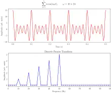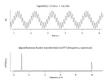 A Fast Fourier Transform (FFT) is an algorithm that computes the Discrete Fourier Transform (DFT) of a sequence, or its inverse (IDFT). Fourier analysis converts a signal from its original domain (often time or space) to a representation in the frequency domain and vice versa. The DFT is obtained by decomposing a sequence of values into components of different frequencies.[1] This operation is useful in many fields, but computing it directly from the definition is often too slow to be practical. An FFT rapidly computes such transformations by factorizing the DFT matrix into a product of sparse (mostly zero) factors.[2] As a result, it manages to reduce the complexity of computing the DFT from , which arises if one simply applies the definition of DFT, to , where n is the data size. The difference in speed can be enormous, especially for long data sets where n may be in the thousands or millions. In the presence of round-off error, many FFT algorithms are much more accurate than evaluating the DFT definition directly or indirectly. There are many different FFT algorithms based on a wide range of published theories, from simple complex-number arithmetic to group theory and number theory.