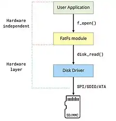 FatFs is designed to be a Filesystem Layer that is agnostic to the platform and storage media it is used with. This is achieved by providing a media access interface that is used to communicate with the storage device control module which is provided by the implementer.[5] This means that FatFs can work with any physical device such as an SD card or a hard disk on any platform that can run plain C code if the implementer provides a control module interface.
