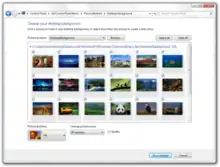 The default theme in Windows 7 consists of a single desktop wallpaper named "Harmony" and the default desktop icons, mouse cursors, and sound scheme introduced in Windows Vista; however, none of the desktop backgrounds included with Windows Vista are present in Windows 7. New themes include Architecture, Characters, Landscapes, Nature, and Scenes, and an additional country-specific theme that is determined based on the defined locale when the operating system is installed; although only the theme for a user's home country is displayed within the user interface, the files for all of these other country-specific themes are included in the operating system.[5] All themes included in Windows 7—excluding the default theme—include six wallpaper images.[3] A number of new sound schemes (each associated with an included theme) have also been introduced: Afternoon, Calligraphy, Characters, Cityscape, Delta, Festival, Garden, Heritage, Landscape, Quirky, Raga, Savana, and Sonata.[6][7] Themes may introduce their own custom sounds, which can be used with others themes as well.[8]