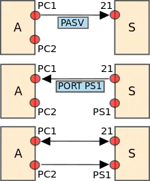 - In situations where the client is behind a firewall and unable to accept incoming TCP connections, passive mode may be used. In this mode, the client uses the control connection to send a PASV command to the server and then receives a server IP address and server port number from the server,[9] which the client then uses to open a data connection from an arbitrary client port to the server IP address and server port number received.[11]