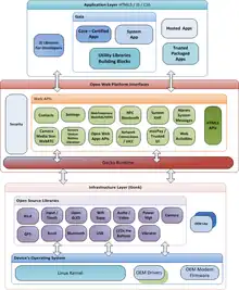 Firefox OS was designed to provide a complete,[9] community-based alternative operating system, for running web applications directly or those installed from an application marketplace. The applications use open standards and approaches such as JavaScript and HTML5, a robust privilege model, and open web APIs that can communicate directly with hardware, e.g. cellphone hardware.[5] As such, Mozilla with Firefox OS competed with commercially developed operating systems such as Apple's iOS, Google's Android, Microsoft's Windows Phone,[9] BlackBerry's BlackBerry 10, Samsung's/Linux Foundation's Tizen, and Jolla's Sailfish OS. In December 2015, Mozilla announced it would stop development of new Firefox OS smartphones[10] and, in September 2016, announced the end of development.[11] Successors to Firefox OS include the discontinued B2G OS[12] and Acadine Technologies' H5OS as well as KaiOS Technologies' KaiOS and Panasonic's My Home Screen.[13][14]