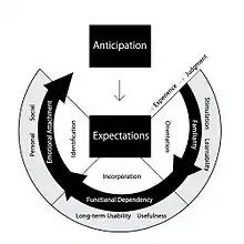 The experience of a service or product's use is consistent of three main forces: familiarity, functional dependency, and emotional attachment. These three forces are responsible for shifting a users' experience across three phases: orientation, incorporation, and identification, respectively. The incorporation factor is the most significant user experience phase of the three. Incorporation makes long-term usability become much more important than the initial learnability, and the product's usefulness becomes the main factor impacting the product's overall value in the eye of the user. As the user accepts the product into their lives, it participates in normal social interactions, and integrates with part of the users self-identity that connects to others and creates a sense of community, building identification.[9] The actual experience with the product has been found to be more influential to users' satisfaction than their prior expectations, though the act of anticipation and creation of expectations is a crucial part of the primary user experience. Sometimes anticipating experiences with a product becomes even more important, emotional, and memorable than the experiences itself.