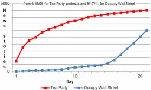 FiveThirtyEight published a graph showing different growth curves of the news stories covering Tea Party and Occupy Wall Street protests. Silver pointed out that conflicts with the police caused the sharpest increases in news coverage of the protests[538 63] and assessed the geography of the protests by analyzing news reports of the size and location of events across the United States.[538 64]