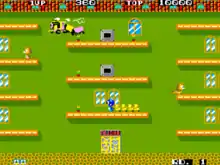 Flicky is a platform game in which the player takes control of a flightless blue bird named Flicky. With only the ability to run side-to-side and jump, the player must collect all the small, yellow birds called "Chirps" and take them to the exit to clear each round.[1] According to game artist Yoshiki Kawasaki, Flicky is just a friend to the Chirps although some players may think she is a mother to them.[2] The Chirps follow Flicky in a chain until they are collected at the exit.[1] Bonus points are awarded for bringing multiple Chirps back in a single chain.[3] There are 48 total stages. Each stage takes place on a single wraparound screen that scrolls horizontally with Flicky always in the center. After all the stages are completed, the game loops infinitely on an increased difficulty mode.[1]