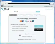 Flock is a discontinued web browser that specialized in providing social networking and Web 2.0 facilities built into its user interface.[4] Earlier versions of Flock used the Gecko HTML rendering engine by Mozilla. Version 2.6.2, released on January 27, 2011, was the last version based on Mozilla Firefox.[5][6] Starting with version 3, Flock was based on Chromium and so used the WebKit rendering engine.[7][8] Flock was available as a free download, and supported Microsoft Windows, Mac OS X and, at one time, Linux as well.