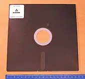 The first commercial floppy disks, developed in the late 1960s, were 8 inches (203.2 mm) in diameter;[2][3] they became commercially available in 1971 as a component of IBM products and both drives and disks were then sold separately starting in 1972 by Memorex and others.[4] These disks and associated drives were produced and improved upon by IBM and other companies such as Memorex, Shugart Associates, and Burroughs Corporation.[5] The term "floppy disk" appeared in print as early as 1970,[6] and although IBM announced its first media as the Type 1 Diskette in 1973, the industry continued to use the terms "floppy disk" or "floppy".