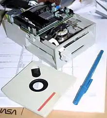 A flippy disk (sometimes known as a "flippy") is a double-sided 5+1⁄4-inch floppy disk, specially modified so that the two sides can be used independently (but not simultaneously) in single-sided drives. Many commercial publishers of computer software (mainly, relatively small programs like arcade games that could fit on a single-sided floppy disk) distributed their products on flippy disks formatted for two different brands of computer, e.g. TRS-80 on one side and Apple on the other. Compute! published an article on the topic in March 1981.[24]