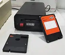 A magnetic disk in a hard plastic shell was invented by Marcell Jánosi, who was working at the Hungarian Budapest Radio Technology Factory (Budapesti Rádiótechnikai Gyár, BRG), in 1973.[11][12] In 1982, such a product, the 3-inch MCD-1 was announced internationally and Jack Tramiel showed interest in using the technology in his Commodore computers, but negotiations fell through.[13] Versions of the floppy drive was released in minimal quantity for the ZX Spectrum and Commodore 64, and some computers made in East Germany were also equipped with one.[14] The floppies are single sided and can hold up to 149 KB of data when MFM formatted. The drives were compatible with contemporary floppy controllers.[15][16] Production was very limited in the early 1980s due to manufacturing problems and the product was abandoned by 1984 after the industry adopted a standard 3.5 inch format.[17]