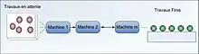 In the standard three-field notation for optimal-job-scheduling problems, the flow-shop variant is denoted by F in the first field. For example, the problem denoted by " F3||" is a 3-machines flow-shop problem with unit processing times, where the goal is to minimize the maximum completion time.
