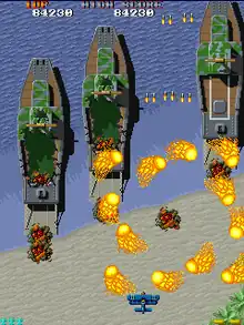 Players are given three lives initially and bonus lives are awarded at 50000 points and thereafter.[1] The game employs a checkpoint system in which a downed single player will start off at the beginning of the checkpoint they managed to reach before dying. Getting hit by enemy fire will result in losing a live, as well as a penalty of decreasing the plane's firepower to his original state and once all lives are lost, the game is over unless players insert more credits into the arcade machine to continue playing. Completing the last stage restarts the game with the second loop increasing in difficulty.[2]