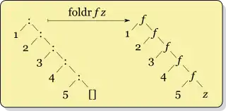 Folds can be regarded as consistently replacing the structural components of a data structure with functions and values. Lists, for example, are built up in many functional languages from two primitives: any list is either an empty list, commonly called nil ([]), or is constructed by prefixing an element in front of another list, creating what is called a cons node ( Cons(X1,Cons(X2,Cons(...(Cons(Xn,nil))))) ), resulting from application of a cons function (written down as a colon (:) in Haskell). One can view a fold on lists as replacing the nil at the end of the list with a specific value, and replacing each cons with a specific function. These replacements can be viewed as a diagram: