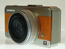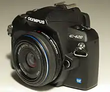 An Olympus E-420 camera, sold with a very thin 25mm "pancake" lens. The E-4XX series was advertised as the smallest true DSLR in the world.[22] - Telecentric optical path means that light hitting the sensor is traveling closer to perpendicular to the sensor, resulting in brighter corners, and improved off-center resolution, particularly on wide angle lenses.