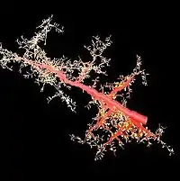 Fractals often appear in the realm of living organisms where they arise through branching processes and other complex pattern formation. Ian Wong and co-workers have shown that migrating cells can form fractals by clustering and branching.[70] Nerve cells function through processes at the cell surface, with phenomena that are enhanced by largely increasing the surface to volume ratio. As a consequence nerve cells often are found to form into fractal patterns.[71] These processes are crucial in cell physiology and different pathologies.[72]