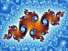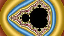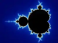 In mathematics, a fractal is a geometric shape containing detailed structure at arbitrarily small scales, usually having a fractal dimension strictly exceeding the topological dimension. Many fractals appear similar at various scales, as illustrated in successive magnifications of the Mandelbrot set.[1][2][3][4] This exhibition of similar patterns at increasingly smaller scales is called self-similarity, also known as expanding symmetry or unfolding symmetry; if this replication is exactly the same at every scale, as in the Menger sponge, the shape is called affine self-similar.[5] Fractal geometry lies within the mathematical branch of measure theory.