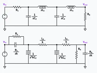 If all the impedances (including the source and load impedances) of a passive ladder filter are divided by sk, the transfer function is not changed. The effect of this division is to transform resistors into capacitors, inductors into resistors and capacitors into FDNRs. The purpose of this transformation is to eliminate inductors which are often problematic components. This technique is especially useful when all the capacitors are grounded. If the technique is applied to capacitors that are not grounded, the resulting FDNRs are floating (neither end is grounded), which in practice, can be difficult to stabilize.
