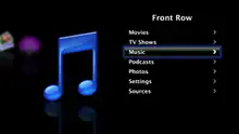Front Row is a discontinued media center software application for Apple's Macintosh computers and Apple TV for navigating and viewing video, photos, podcasts and music from a computer, optical disc or the Internet through a 10-foot user interface (similar to Kodi and Windows Media Center). The software relies on iTunes and iPhoto and is controlled by an Apple Remote or the keyboard function keys. The first version was released in October 2005, with two major revisions since. Front Row was removed and discontinued in Mac OS X 10.7.[1]