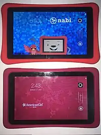 With profit margins as low as $5 per unit, Fuhu relied on accessories for the Nabi to increase its profits.[1] Each Nabi tablet featured a small grid on the reverse that could hold rubberized block letters called KINABI, allowing children to customize their devices with short words or names.[29] Fuhu also created Nabi Frames, stickers that surrounded the tablet screen, featuring characters from popular children's television shows.[1] Other accessories included cases, backpacks, screen protectors, car chargers with cords long enough to reach the back seat of a vehicle, and cameras.[1]