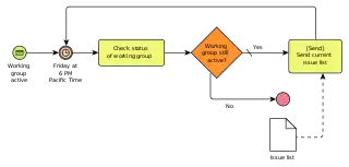 Business Process Model and Notation (BPMN) is a graphical representation for specifying business processes in a workflow. BPMN was developed by Business Process Management Initiative (BPMI), and is currently maintained by the Object Management Group since the two organizations merged in 2005. The current version of BPMN is 2.0.[29]