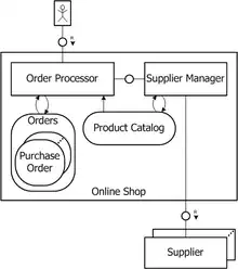 The image to the right is an example of a compositional structure diagram. It contains the agents Order Processor, Supplier Manager, Supplier, Online Shop and an unnamed human agent. Agents are represented by rectangles. The dots and the shadow of the agent Supplier indicate that this agent has multiple instances, i.e. the Supplier Manager communicates with one or many suppliers. The so-called human agent represents a user interacting with the system.