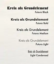 Futura is a geometric sans-serif typeface designed by Paul Renner and released in 1927.[1] It was designed as a contribution on the New Frankfurt-project. It is based on geometric shapes, especially the circle, similar in spirit to the Bauhaus design style of the period.[2][3] It was developed as a typeface by the Bauer Type Foundry (Bauersche Gießerei), in competition with Ludwig & Mayer's seminal Erbar typeface of 1926.[4][5]