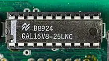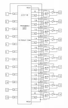 The GAL22V10 is a series of programmable-logic devices from Lattice Semiconductor, implemented as CMOS-based generic array logic ICs, and available in dual inline packages or plastic leaded chip carriers. It is an example of a standard production GAL device that is often used in educational settings as a basic programmable-logic device.[1][2][3] In combinatorial mode, it is conceptually a group of programmable AND-OR-invert (AOI) (AND-NOR) gates or AND-OR gates.