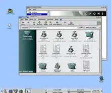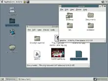 GNOME 2 was released in June 2002[38][39] and was very similar to a conventional desktop interface, featuring a simple desktop in which users could interact with virtual objects such as windows, icons, and files. GNOME 2 started out with Sawfish as its default window manager, but later switched to Metacity in GNOME 2.2.[40][41] The handling of windows, applications, and files in GNOME 2 is similar to that of contemporary desktop operating systems. In the default configuration of GNOME 2, the desktop has a launcher menu for quick access to installed programs and file locations; open windows may be accessed by a taskbar along the bottom of the screen; and the top-right corner features a notification area for programs to display notices while running in the background. However, these features can be moved to almost any position or orientation the user desires, replaced with other functions, or removed altogether.