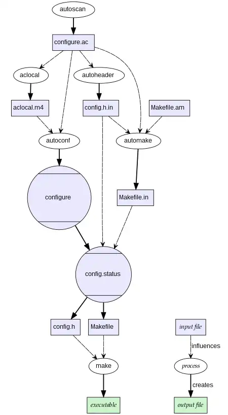 Autoconf generates a configure script based on the contents of a configure.ac file, which characterizes a particular body of source code. The configure script, when run, scans the build environment and generates a subordinate config.status script which, in turn, converts other input files and most commonly Makefile.in into output files (Makefile), which are appropriate for that build environment. Finally, the make program uses Makefile to generate executable programs from source code.