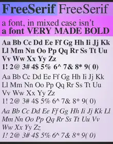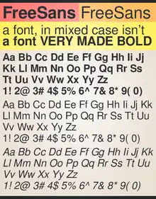 GNU FreeFont (also known as Free UCS Outline Fonts) is a family of free OpenType, TrueType and WOFF vector fonts, implementing as much of the Universal Character Set (UCS) as possible, aside from the very large CJK Asian character set. The project was initiated in 2002 by Primož Peterlin and is now maintained by Steve White.