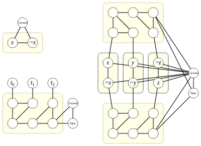 For instance, the problem of testing 3-colorability of graphs may be proven NP-complete by a reduction from 3-satisfiability of this type. The reduction uses two special graph vertices, labeled as "Ground" and "False", that are not part of any gadget. As shown in the figure, the gadget for a variable x consists of two vertices connected in a triangle with the ground vertex; one of the two vertices of the gadget is labeled with x and the other is labeled with the negation of x. The gadget for a clause (t0 ∨ t1 ∨ t2) consists of six vertices, connected to each other, to the vertices representing the terms t0, t1, and t2, and to the ground and false vertices by the edges shown. Any 3-CNF formula may be converted into a graph by constructing a separate gadget for each of its variables and clauses and connecting them as shown.[5]