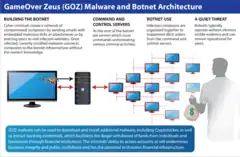 Machines infected with GOZ were integrated into a botnet, a system of several devices that could be controlled remotely through the malware. At the peak of GOZ activity from 2012 to 2013, the botnet comprised between 500,000 and one million compromised computers.[1] Botnet-building capabilities were common to all ZeuS variants; however, while previous iterations of the malware created centralized botnets, wherein all infected devices were connected directly to a command-and-control (C2) server, GameOver ZeuS utilized a decentralized, peer-to-peer infrastructure.[2]