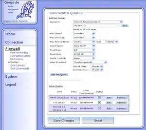 Gargoyle is a free OpenWrt-based Linux distribution for a range of wireless routers based on Broadcom, Atheros, MediaTek and others chipsets,[2][3] Asus Routers, Netgear, Linksys and TP-Link routers. Among notable features is the ability to limit and monitor bandwidth and set bandwidth caps per specific IP address.[4][5][6][7]