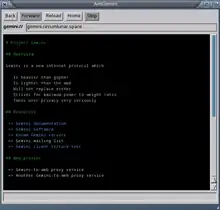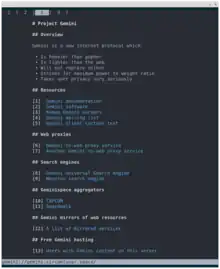 "Geminispace" denotes the whole of the public resources that are published on the Internet by the Gemini community via the Gemini protocol. Thus, Gemini spans an alternative communication web, with hypertext documents, including hyperlinks to other resources easily accessible to the user.[1]