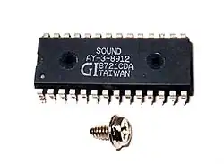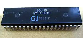 The AY-3-8910 is a 3-voice programmable sound generator (PSG) designed by General Instrument (GI) in 1978, initially for use with their 16-bit CP1610 or one of the PIC1650 series of 8-bit microcomputers. The AY-3-8910 and its variants were used in many arcade gamesโKonami's Gyruss contains five[1]โand Bally pinball machines as well as being the sound chip in the Intellivision and Vectrex video game consoles, and the Amstrad CPC, Oric-1, Colour Genie, Elektor TV Games Computer, MSX, Tiki 100 and later ZX Spectrum home computers. It was also used in the Mockingboard and Cricket sound cards for the Apple II and the Speech/Sound Cartridge[2] for the TRS-80 Color Computer.