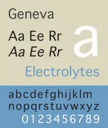 Media related to Geneva (typeface) at Wikimedia Commons- Notes on 4 Apple Fonts – a description of the design of the TrueType versions of Chicago, New York, Geneva and Monaco.