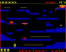 Ghouls is a platform game, set in a creepy mansion on top of a hill.[4] The player character has the appearance of a Pac-Man sprite on legs and in a similarity to that game can also eat yellow dots for extra points.[4] The main goal of the game however, is to obtain the treasure which is guarded by the deadly inhabitants of the mansion. The player must make their way through rooms such as Spectre's Lair, Horrid Hall, The Spider's Parlour and Death Tower.[4]