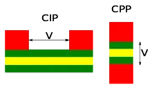 Electric current can be passed through magnetic superlattices in two ways. In the current in plane (CIP) geometry, the current flows along the layers, and the electrodes are located on one side of the structure. In the current perpendicular to plane (CPP) configuration, the current is passed perpendicular to the layers, and the electrodes are located on different sides of the superlattice.[7] The CPP geometry results in more than twice higher GMR, but is more difficult to realize in practice than the CIP configuration.[25][26]