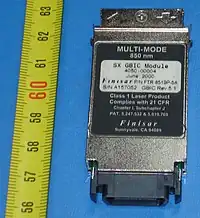 A gigabit interface converter (GBIC) is a standard for transceivers, first defined in 1995 and commonly used with Gigabit Ethernet and Fibre Channel for some time. By offering a standard, hot swappable electrical interface, a single gigabit port can support a wide range of physical media, from copper to long-wave single-mode optical fiber, at lengths of hundreds of kilometers.[1]