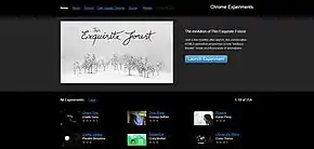 Google's Chrome Experiments was launched in March 2009 with 19 experiments.[1] The main reason for its inception was to demonstrate and test the abilities of JavaScript and Google's V8 JavaScript engine. With time it also started featuring other open source web-based technologies such as HTML, Scalable Vector Graphics (SVG), WebGL, Web Audio, and Canvas element. The focus of the project throughout has been on open source technology and thus does not feature proprietary software such as Adobe Flash. The website is steadily gaining popularity along with the number of featured experiments. The number of experiments increased to 50 by August 2009,[2] to 100 by July 2010,[3] and to 500 by September 2012.[4] As of August 2013 the number of experiments on the website were way over 600.