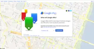 Google Offers was a service offering discounts and coupons. Initially, it was a deal-of-the-day website similar to Groupon, but it later changed focus. Rather than a small number of prepaid offers, it instead offered many smaller discounts. It is additionally integrated with both Google Maps and Google Wallet for mobile offers.[2] In 2014, Google announced it would be shutting the service down.